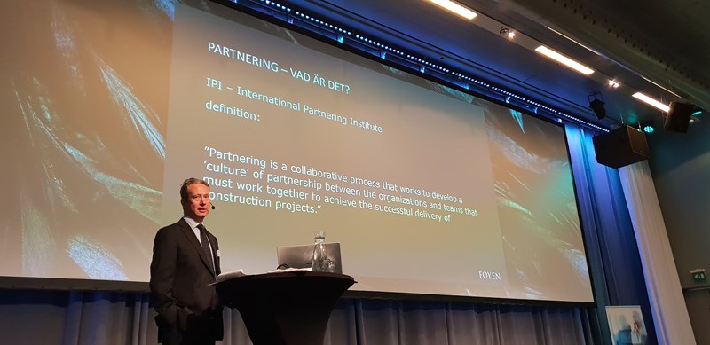 John Hane som är advokat vid Foyen och en känd profil i branschen, gav deltagarna en inblick i juridiken vid samverkan i projekt. John har varit med om många tvister i branschen, ofta har rättegångskostnaderna överstigit beloppen man tvistat om. Varför tar man inte vara på kompetensen i branschen, frågar sig John. Det finns mallkontrakt att använda som John varit med och tagit fram, något han uppmuntrade deltagarna att gärna utgå ifrån om man vill jobba i samverkan. Man jobbar även med dessa frågor internationellt, John refererade till IPI som står för International Partnering Institute. Den främsta anledningen till att driva byggprojekt i samverkan enligt John är att man kraftigt kan reducera andelen claims, det så kallade ÄTA-kriget som ofta uppstår. I en studie från järnvägsprojekt i Californien gick man i andel från 10 till 1 claim per projekt genom att driva projekt enligt samverkansprinciper. I Sverige anses inte branschen vara riktigt mogen för delat ansvar juridiskt, vi har fortfarande utpekat projekteringsansvar. Johns tips på framgångsfaktorer är tillit, med andra ord ömsesidig förståelse och gemensamma mål. Här kan man nyttja en neutral moderator och relationsbyggande aktiviteter. Det behövs dock konkret vägledning genom avtal som är utformade för att hantera samverkan. Avslutningsvis pratade John om upphandling och att det är fullt möjligt att upphandla i linje med samverkan, där deltagarna fick en hel del tips och många passade på att ställa frågor.