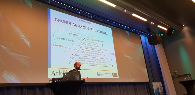 Klas Skogmar delade med sig av sin kunskap när det kommer till standarder. Standarder ger effekter såsom minskade språkbarriärer och ökat förtroende inom projekt. Klas gav en jämförelse mellan standarder såsom ISO och PMI, samt gick igenom den internationellt spridda metodiken PRINCE2. Klas höjde ett varningens finger för metoder med överlämningar. Det är bättre med överlapp där t ex kravarbete följer med från start till genomförande. Klas konstaterade att standarder och metoder går att kombinera och att de ofta kompletterar varandra. Det gäller att anpassa dem efter verksamhetens behov, då fås bäst effekt.