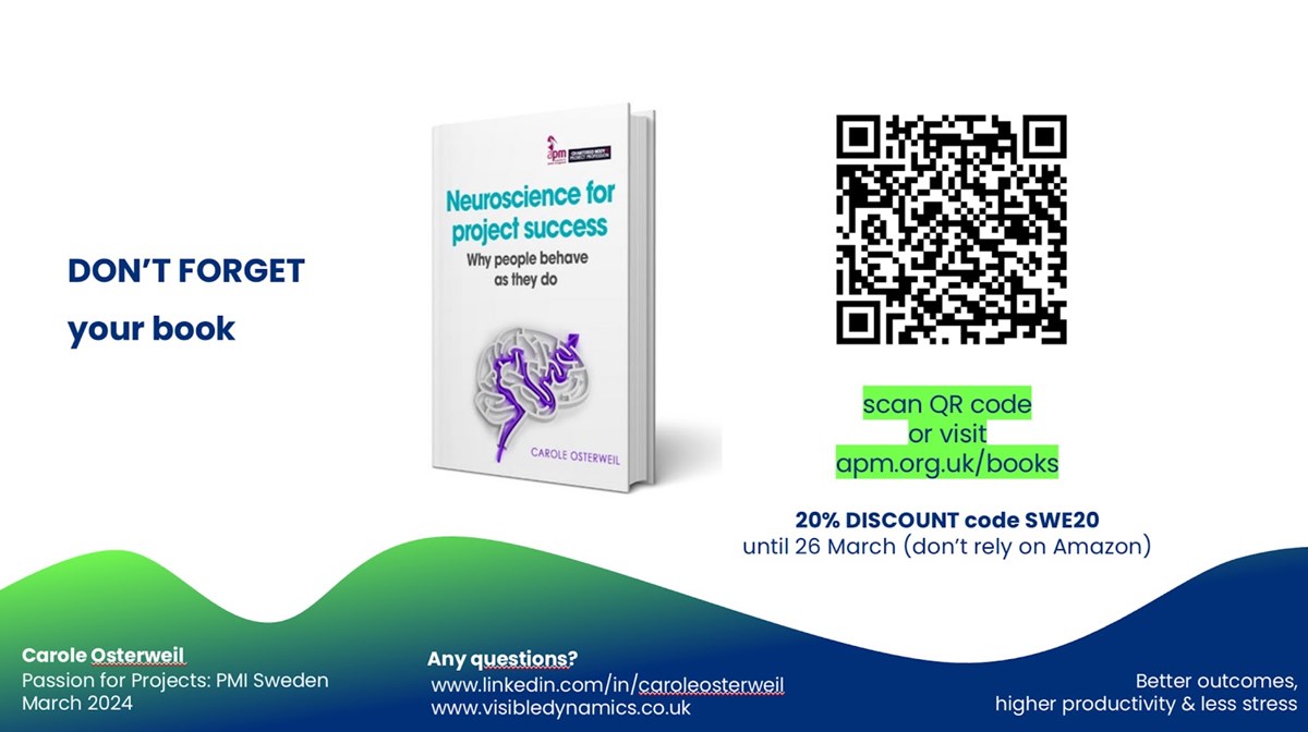 Carole Osterweil talade om neurovetenskap för projektframgång: varför människor beter sig som de gör. Hon erbjuder nu en rabattkod till sin bok, se nedan QR-kod.